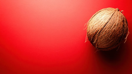 A solitary coconut rests on a vibrant red background, showcasing its rustic texture and organic beauty. Perfect for food-related themes and tropical concepts.