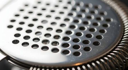 An extreme close-up, macro shot of a stainless steel Hawthorne cocktail strainer. The image focuses on the detailed pattern of perforated holes and the coiled spring, highlighting a key piece of bartending equipment.
