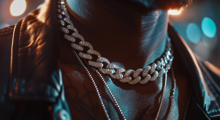 This stunning gold chain necklace features intricate designs and sparkling gems, perfect for adding a touch of elegance to any outfit. The close-up view highlights the exquisite craftsmanship and luxurious details that make this jewelry piece stand out.