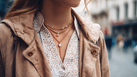 A stylish young woman showcases exquisite jewelry in an urban environment on a sunny day, capturing elegance and modern fashion trends in her look.