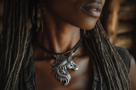 A woman with long braided hair showcases a detailed silver horse pendant necklace. She stands in a warm, rustic environment, highlighting her unique accessory.