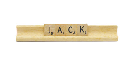 Miami, FL 4-18-24 popular baby boy first name of JACK made with square wooden tile English alphabet letters with natural color and grain on a wood rack holder isolated on white background