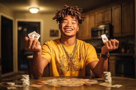 A teenage boy of mixed race smiles widely while holding playing cards in each hand. He sits at a table surrounded by poker chips and a board game in a cozy, well-lit room.