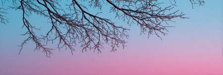 Branches reach out toward the colorful sky at twilight, displaying shades of blue and pink blending together as day gives way to night.
