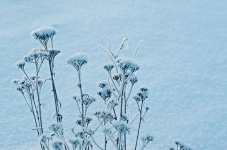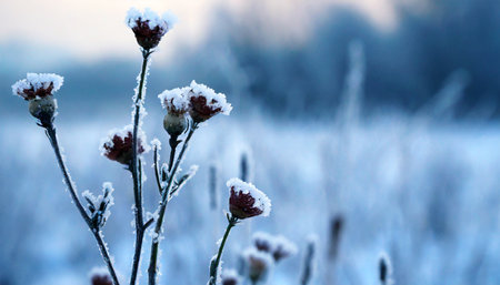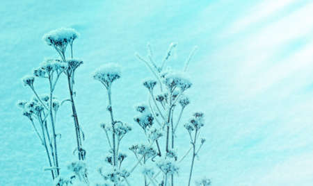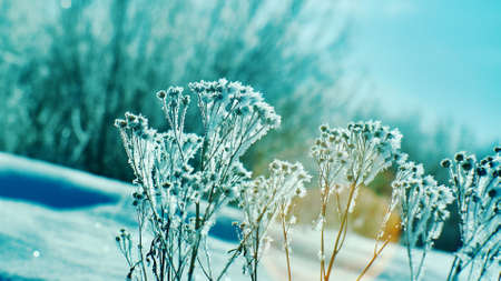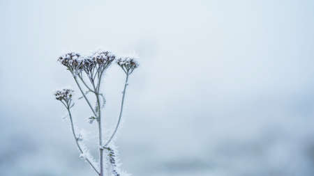 frozen icy flowers in winter frost covered wildflowers in winter field on the evening or mourning cold winter season frosty weather natural blue and white background with copy space