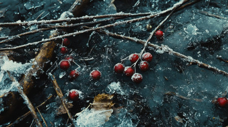 A close-up scene depicting frosty berries and branches resting on a frozen surface, highlighting the stark beauty of winter's chill and nature's textures.