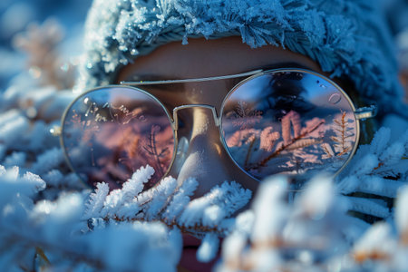 Close Up of a Person Wearing Sunglasses With Frosty Branches Reflecting in the Lenses