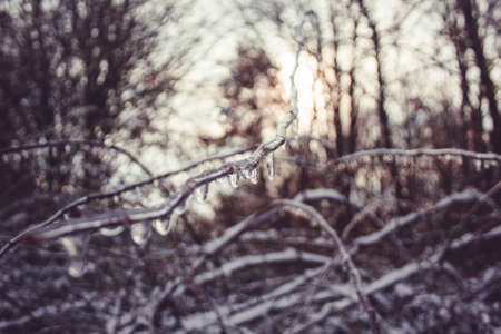 Naked tree branches covered with icy after freezing rain