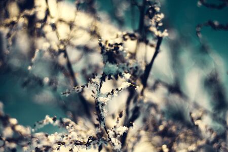 Abstract blue background branches in frost under white snow close-up. Magical winter beautiful background. Unusual natural background.