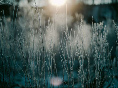 Forest floor of dry plants in hoarfrost, close-up. Morning fog. Seasons, climate change, ecology, botany. Natural blue and white background. Macro Photography, copy space