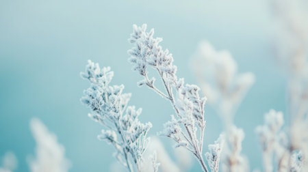 Delicate branches adorned with frost stretch into a soft icy blue atmosphere. The cold enhances the serene beauty of winter, capturing a tranquil moment in nature.
