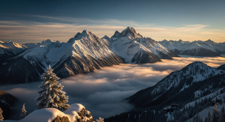 Capture the essence of winter in this stunning landscape featuring snow-capped mountains towering over a misty valley. The serene atmosphere invites exploration.