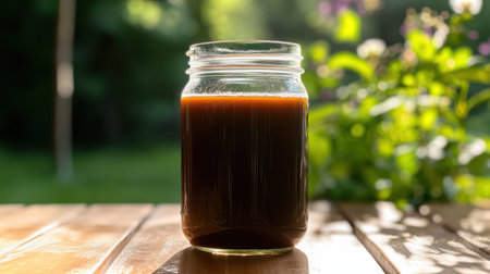 A Cold brew coffee in jar with natural backdrop
