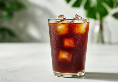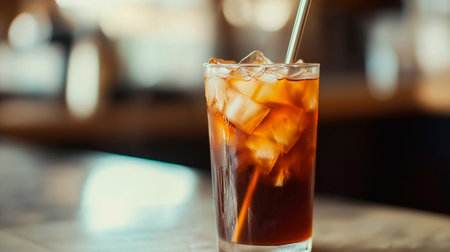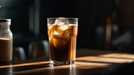 Glass of iced tea with ice cubes and sunlit shaded background. That the image is generated using AI.