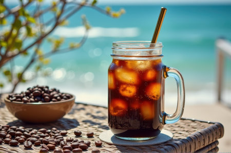 Refreshing iced coffee with ice cubes and metal straw by the beach. That the image is generated using AI.