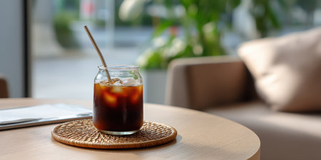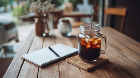 Refreshing glass of iced coffee sits on wooden table, accompanied by notepad and cozy atmosphere. scene evokes sense of relaxation and productivity