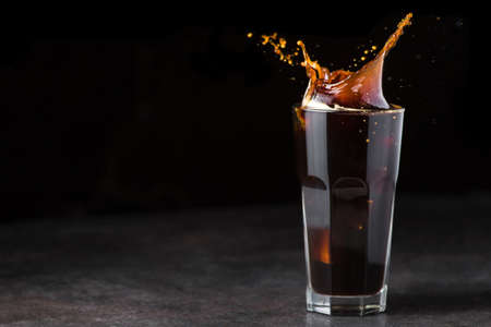 Black iced coffee splash in a glass on black background