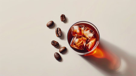 A captivating image of a freshly poured iced coffee drink in a glass, showcasing ice cubes and rich coffee beans, perfect for beverage enthusiasts.