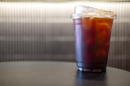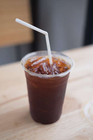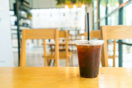 Long black coffee with ice in tall plastic glass in coffee shop