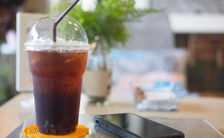Close up iced americano and mobile phone in coffee shop