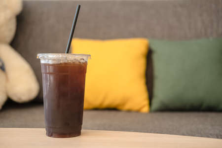 Iced black coffee in a glass on wood table with sofa background