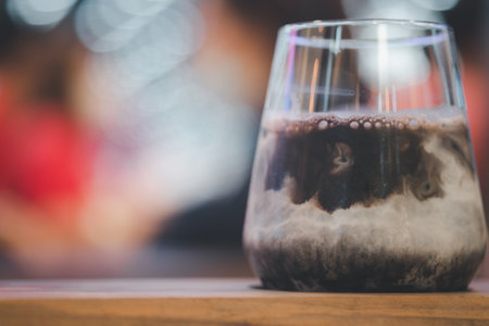 Very bubbly aerated coffee in a glass. Manual brewing, third wave specialty concept