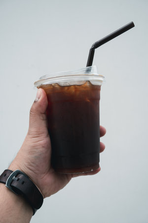 Close up plastic take away cup of iced black coffee in man hand