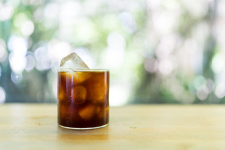 Refreshing iced black coffee with ice cubes with blurred green background