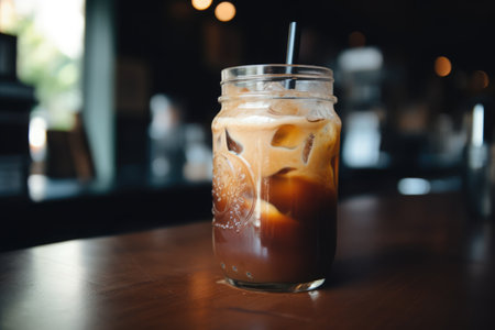 Close-up glass of iced coffee with milk on the table