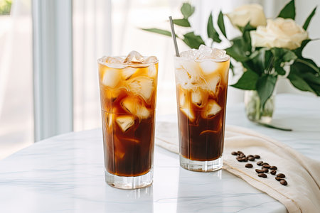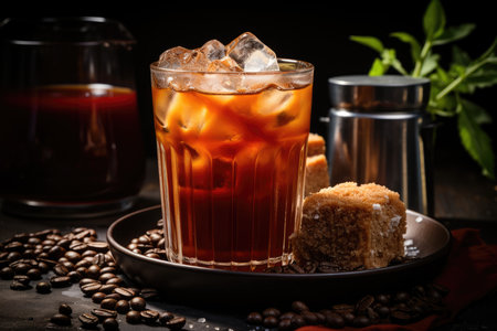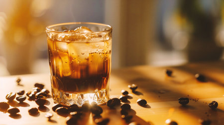 Refreshing iced coffee in sunlit cafe with coffee beans. That the image is generated using AI.
