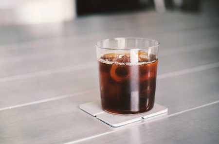 Black iced coffee on the table in coffee shop.