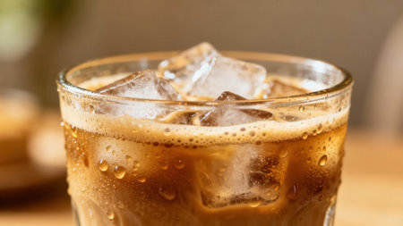 View of dark brown espresso and milk mixture topped with foam and ice, showcasing the texture of dew drops coating the chilled transparent glass.