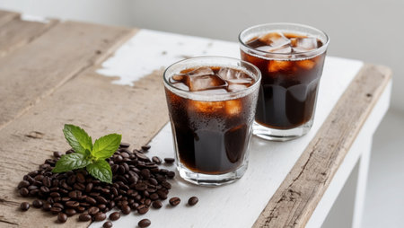 AI Generated. Two glasses of iced coffee sit atop a wooden table with coffee beans and a sprig of mint nearby
