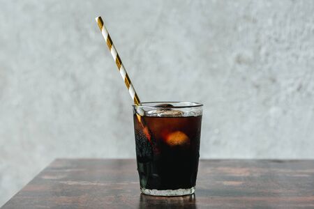 cold brew coffee with ice and drinking straw in glass on wooden table