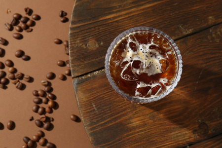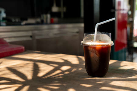 Closeup of takeaway plastic cup of iced Americano on wooden table with sun lighting