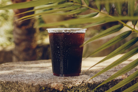 Cold Brew Coffee in Plastic Cup Outdoors with Tropical Leaf Backdrop