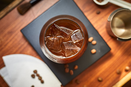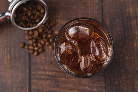 drinks and beverages still-life, cold brew coffee with ice cubes in glass from topdown view