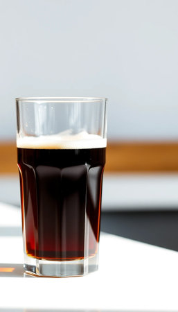 Cold brew coffee in curved tulip glass on table with soft natural light and warm atmosphere