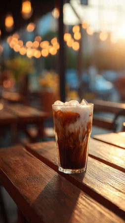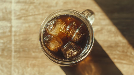 Sun-kissed iced coffee on wooden table.