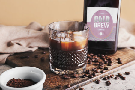 iced coffee, cold brew, beverage, glass, coffee beans, refreshing drink, summer chill, horizontal layout, minimalist style, coffee culture