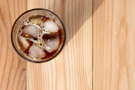 A cup of Iced Americano Coffee with ice cubes placed on a wooden table in a coffee shop. Top view of a glass of coffee.