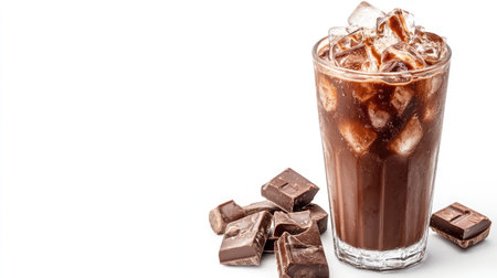 A delicious iced chocolate drink served in a clear glass, filled with ice cubes and accompanied by chocolate pieces, perfect for a refreshing treat.