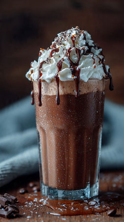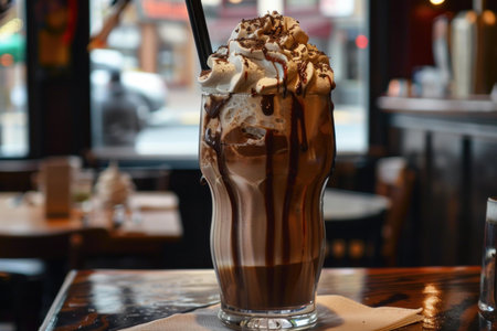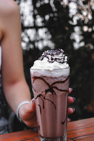 Indulge in a decadent chocolate milkshake delight with whipped cream, shavings, and other sweet toppings at your favorite cafe