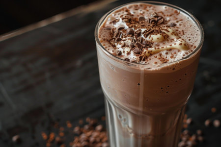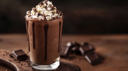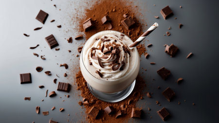 AI Generated. Creamy chocolate milkshake topped with shaved chocolate and surrounded by cocoa and chocolate pieces on a dark surface