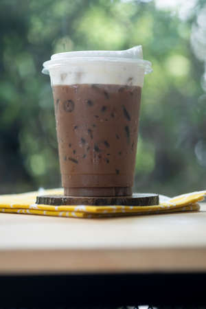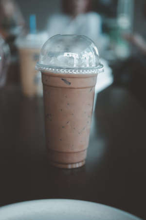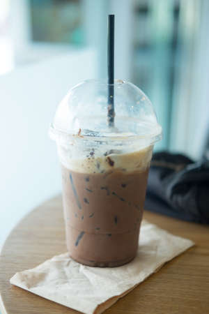 Iced mocha in plastic cup on table. Favorite caffeine beverage menu.