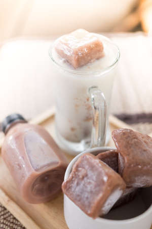 Frozen chocolate ice cubes in a glass poured with milk to make a refreshing summer drink.