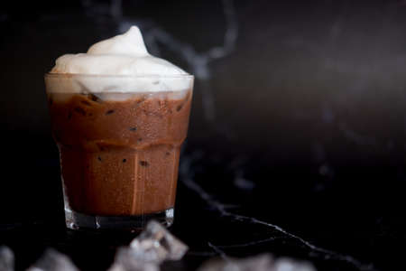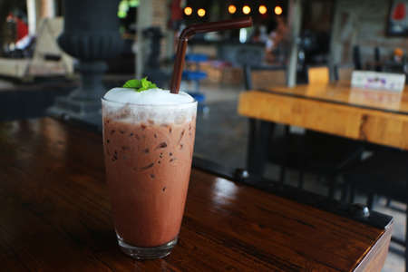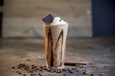 Delicious cold refreshing coffee mocha mix dark chocolate topping with milk froth on wood table