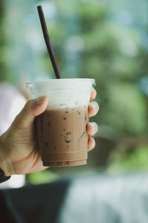 Close up young asian man hand holding takeaway plastic cup of delicious iced Mocha coffee. Healthy refreshing summer drinks concept.
