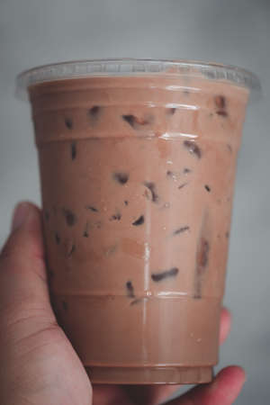 Iced cocoa. Sweet and refreshing. A cup in hand in a modern coffee shop. sweet cup on hand, hold coffe cup
