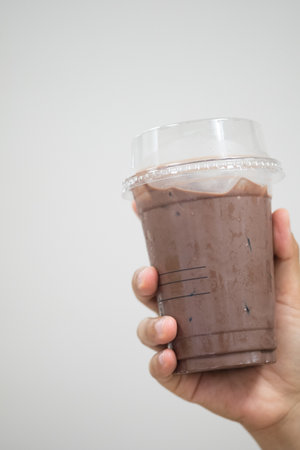 Iced cocoa in plastic cup with lid. Lid design for drink for reduce use of straw, you can drink coffee pass lid